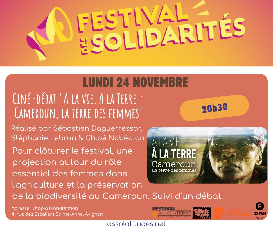 L’édition 2025 du Festival des Solidarités se clôturera le Lundi 24 novembre à 20h30 par la projection du film documentaire “A la vie, A la Terre : Cameroun, la terre des femmes” réalisé par Sébastien Daguerressar, Stéphanie Lebrun et Chloé Nabédian au Cinéma Utopia Manutention.
