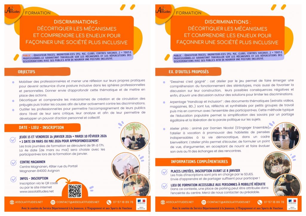 - Jeudi et vendredi 15 et 16 janvier 2026 : un module ludique de deux jours de formation est proposé sur la thématique de la lutte contre les discriminations à partir d’outils d’éducation populaire et d’ECS (Éducation à la Citoyenneté et à la Solidarité).