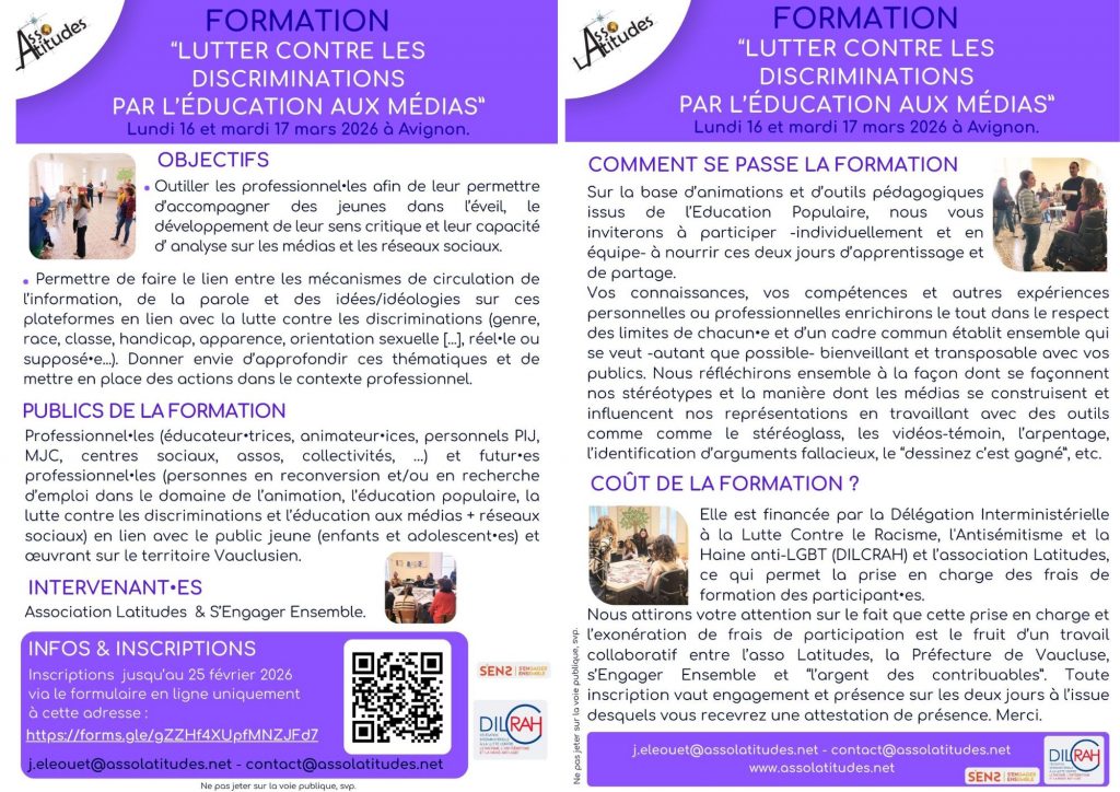 L’association Latitudes et S’engager Ensemble proposent la formation “Lutter contre les discriminations par l’éducation aux médias” qui aura lieu lundi 16 et mardi 17 mars 2026 de 9h à 17h au Centre Magnanen à Avignon.